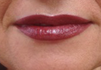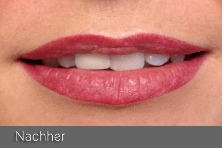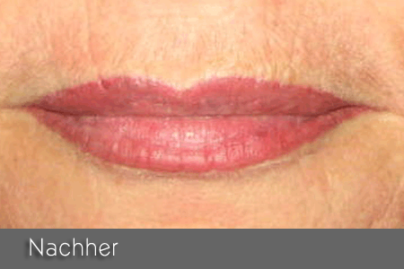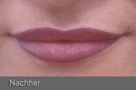 Nach der Behandlung Das Ergebnis der Lippen-Neumodellierung direkt nach der Behandlung. Der Übergang zwischen natürlicher Lippe, der leichten Vergrößerung und die Lippeninnenflächen wurden mit einer speziellen Schattier-Technik und der gewählten Farbe ausgeglichen und vollschattiert. |
